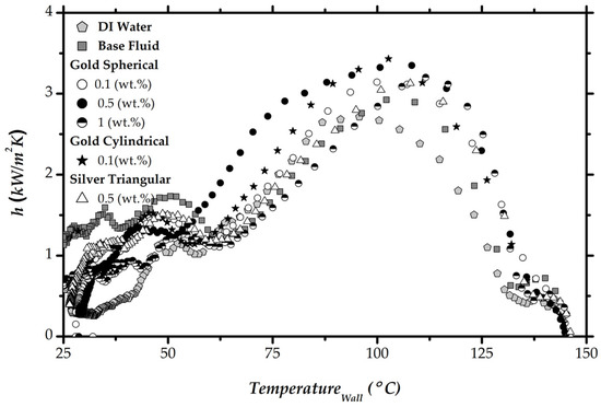 When analyzing the effect of nanoparticles size, geometry, or concentration, their influence is relatively less significant than that caused by the surfactant. Nevertheless, the results depicted in Figure 10 suggest a slight enhancement of heat transfer obtained with the nanofluids resulting from the addition of the gold nanospheres. The reason is likely the higher viscosity resulting from the nanoparticles that tend to increase droplets’ size (although this effect is marginal and not evident in the spray characteristics before impact). It also lessens droplet/film liquid instabilities leading to disintegration, which contributes to concentrating the liquid mass on the wetted area. Consequently, the heat convection coefficients obtained for the nanofluid sprays are higher than those of water and the base fluid, as depicted in Figure 11.