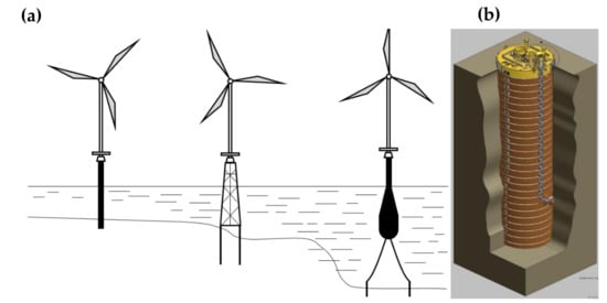 Typical foundation types for offshore wind turbines: (a) offshore wind turbines; (b) suction caisson foundation.