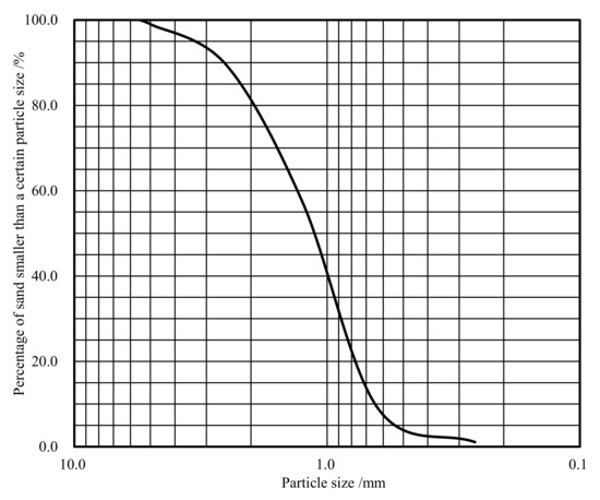 The sand used in this study was selected from a site near the east coast of Qingdao, China, where a proposed wind farm was being built. The grain size distribution of the collected sands is shown in Figure 2. According to ASTM standard D6913/D6913M-17 [37], the collected sand is defined as coarse sand. The prepared sand samples were in a loose state with a void ratio of 0.85. The roundness and the sphericity were 0.49 and 0.65, respectively. As illustrated in Figure 3, sand samples of three different particle size ranges (i.e., 0.63–1.25 mm, 1.25–2.50 mm, and 2.50–5.00 mm) were prepared with the aim of exploring the influence of mean particle size (D50) on the interface behavior. The physical properties of sand samples were obtained according to ASTM D422-63 [38], ASTM D558-11 [39], and ASTM D 854-14 [40], as shown in Table 1. Before the test, the sand samples were dried in a drying box for 24 h and then prepared by the screening method. Note that the moisture (water) content of the sand samples was not considered in this study.