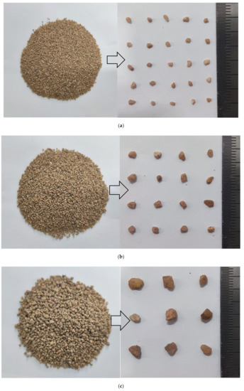 Soil samples with three ranges of particle size: (a) 0.63–1.25 mm sand; (b) 1.25–2.50 mm sand; (c) 2.50–5.00 mm sand.
