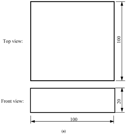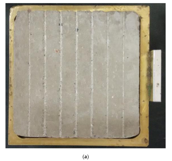 The concrete plates were cast with C30 concrete and the elasticity modulus was 3.0 × 104 N/mm2. The size of the concrete plates was 100 mm (length) × 100 mm (width) × 20 mm (thickness). Three degrees of roughness were designed for the plate surface that interacts with the sand, with the surface grooved along the length of the plate as illustrated in Figure 4. Zero, seven, and nine grooves were fabricated in parallel, respectively, to form different roughness. The cross section of the groove was an isosceles triangle with the base and the height equal to 1.0 mm. The concrete plates with different roughness were placed in the lower shear box in the test (see Figure 5). Note that this method of etching grooves on steel plates is inconsistent with reality. The actual roughness of a concrete surface should be evaluated by a profilometer. In this study, the focus was to investigate the effect of surface roughness on the concrete–sand interface behavior, so the profilometer test was not used. The surface roughness of a structure can be evaluated by several surface roughness assessment methods, such as the sand-pouring method, silica powder clamping method, stylus profilometer method, roughness apparatus method, fractal dimension method, and unveiled coarse grain ratio method. According to Chen’s study [34], the sand-pouring method, stylus touching method, and roughness apparatus method follow the same mechanism. The sand-pouring method is straightforward and convenient to use, but it ignores basic characteristics including the large smooth areas, the depth of individual grooves and regular groove layout, resulting in greater roughness. The silica powder clamping method, fractal dimension method and unveiled coarse grain ratio method are not suitable for evaluating a concrete surface with regular roughness. By considering those features of a surface of regular roughness, a modified poured-sand method was proposed by Chen et al. [34] as follow: