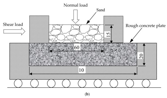 The tests were conducted using a modified shear apparatus, as shown in Figure 5. The upper part of the shear apparatus is a hollow cylinder with 60 mm in diameter and 15 mm in height. The sand samples were poured into the upper part. The lower part of the apparatus was modified with a container (100 mm in length and 100 mm in width) that holds the concrete plate (see Figure 5a). As presented in Figure 5b, the upper part of the shear apparatus was in contact with the concrete plate. However, normal stress was not applied to the contact surface between the upper part and the concrete plate. Normal stress was applied on the top of the sand sample for each combination of relative roughness and particle size range, and was varied as 50, 100, and 150 kPa according to ASTM D3080M-11 [41]. The internal shear test was also conducted using a traditional direct shear apparatus under the same normal stress.