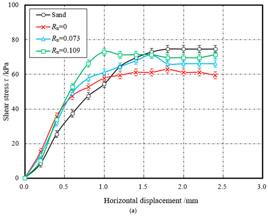 The relationship between shear stress and horizontal displacement obtained from the shear tests under the normal stress of 100 kPa are shown in Figure 6. For comparison, the responses from the shear test of pure sand under the same normal stress are also included. For all tests, the shear stress gradually increased with the horizontal displacement at the beginning until it became relatively constant after a certain amount of displacement.