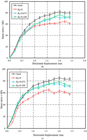 Shear stress–horizontal displacement curves for 100 kPa normal load: (a) 0.63–1.25 mm sand; (b) 1.25–2.50 mm sand; (c) 2.50–5.00 mm sand. Note: Rn is the relative roughness.
