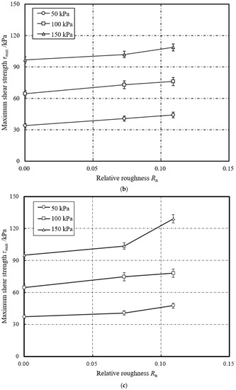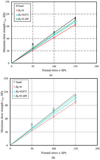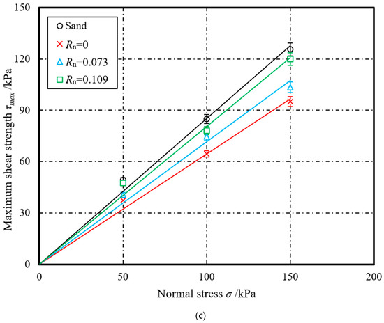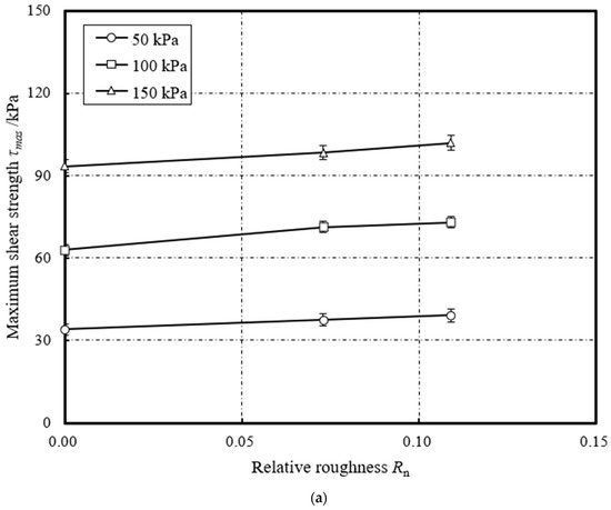Figure 7 shows that the maximum shear stress (τmax) varies with relative roughness (Rn) under the normal stress of 50, 100, and 150 kPa for the same sand particle size ranges of 0.63–1.25 mm, 1.25–2.50 mm, and 2.50–5.00 mm, respectively. It is obvious that the maximum shear stress was greater at higher values of the normal stress. The shear strength between sand and solid material can be depicted using the Mohr–Coulomb failure criterion as