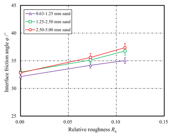 The friction angles in Equation (3) fitted from the experimental results are shown in Figure 9 as a function of the relative roughness. The corresponding values are summarized in Table 2. It is indicated that the critical state interface friction angle (φ) increased with the relative roughness for the explored values of Rn from 0 to 0.109. Taking the sand with the particle size range of 0.63–1.25 mm for an example, the friction angle (φ) between sand and concrete interface with Rn = 0 had a low value of 32.14°, while it increased to around 35.03° as Rn increased to 0.109. A similar trend was also observed for the sand samples of 1.25–2.50 mm. This can be explained by the fact that the surface of solid material with higher relative roughness can promote the redistribution process of sand particles and, thus, result in the fracture of the contact bond between sand particles in the shear test [42]. As a result, more contact area between sand and concrete in the shear test will appear and cause a greater maximum shear stress and friction angle. However, the sand with the particle size of 2.5–5.0 mm is not very representative of the performed campaign due to the scale effect.