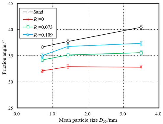 Figure 10 presents the variation of the interface friction angle (φ) with mean particle size (D50) = 0.71 mm, 1.43 mm, and 3.50 mm, respectively, for particle size ranges of 0.63–1.25 mm, 1.25–2.50 mm, and 2.50–5.00 mm and for different levels of relative roughness (Rn). The friction angles (φ′) of pure sand derived from the direct shear test are also included in the figure for comparison. For pure sand, it can be seen that the value of φ′ increased almost linearly with D50. By contrast, the impact of mean particle size (D50) on the friction angle (φ) for the sand–concrete interface was less significant. Although the friction angle for different relative roughness had an average increase of 7.15% as D50 increased from 0.71 mm to 1.43 mm, the difference between the friction angles for D50 = 1.43 mm and 3.5 mm was minimal.