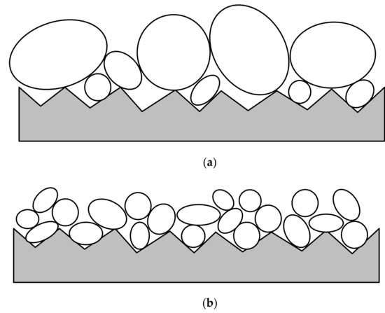 The above phenomena can be deciphered from the perspective of particle breakage. It is well known that sand particle breakage plays an important role in shear strength [42,43]. Generally, sand with larger particles is more likely to break during shearing, as there are more flaws and defects in the particles. As shown in Figure 11, smaller particles produced by large particles can fill the void in sand samples and concrete grooves under limited pressure during the shearing process. Compared with the shearing of pure sand, particle breakage and embedded fine particles is much more significant during the interaction between sand and solid materials, due to particle collisions and rearrangements. However, the crushing was not measured in this study. Therefore, the impact of particle size on the friction angle is more significant for pure sand than for the sand–concrete interface, as large particles will eventually break into small particles due to particle breakage during the shearing process.