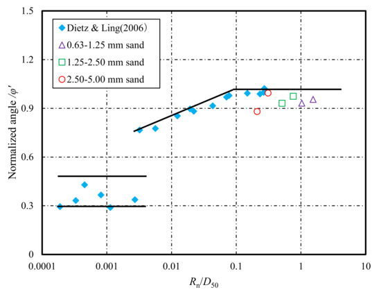 Dietz and Ling [44] investigated the interface shear behavior between mild steel and sand under large relative displacement by a ring shear apparatus. They demonstrated the ratio of relative roughness (Rn) to mean particle size (D50) (i.e., Rn/D50), plotted against the interface friction angle (φ) normalized by the friction angle (φ′) of pure sand (φ/φ′). This normalization brought three different trends, as shown in Figure 12. For comparison, the data obtained in this study are also illustrated in Figure 12. Note that in the study of Dietz and Ling [44], though the surface roughness was evaluated by a profilometer, the obtained roughness (Rn) was similar to that in this study. This proposed reevaluated method of relative roughness is not the same as that defined by Uesugi et al. [45]. However, this modified method was also widely used as it is straightforward and convenient. It also can be seen that the normalized data φ/φ′ in this study are approximately equal to that of Dietz and Ling [44], which range from around 0.9 to 1.0. The data from Dietz and Ling [44] and Han et al. [46] are also presented in this figure for comparison. The Rn values in these two references are defined by the method of Uesign et al. [45], which was almost the same with a modified poured-sand method [35]. This indicates that the shear performance of the sand–concrete interface is similar to that of the sand–mild steel interface. This may be because this study describes post-peak shear behavior; however, these two references by Dietz and Ling [44] and Han et al. [46] describe post-peak shear behavior.