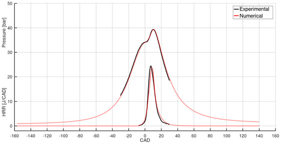 Comparison between experimental and numerical results in terms of in-cylinder pressure and heat release rate (HRR).
