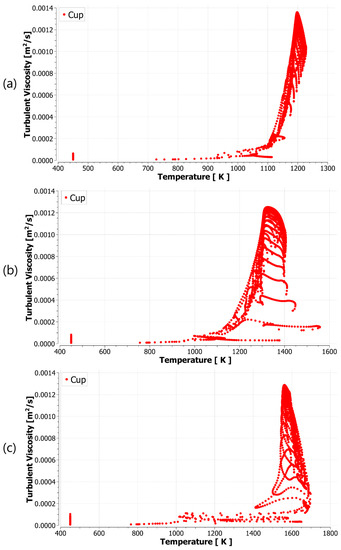 Scatter plots of the turbulent diffusivity as a function of gas temperature at different crank angles: (a) TDC; (b) 5 CAD ATDC; (c) 10 CAD ATDC.