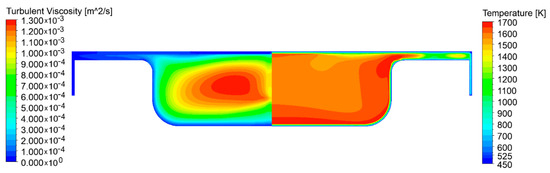 Figure 5a, which refers to TDC, shows that the regions in the piston cup where chemical reactions proceeded faster at the start of combustion were characterized by a turbulent diffusivity of about and a temperature of about 1225 K. The maximum value of turbulent diffusivity at TDC was , which corresponds to a temperature of about 1190 K. The influence of turbulence on the combustion process was even stronger when considering the situations at 5 and 10 CAD ATDC in Figure 5b,c, respectively. The figure shows that the combustion process sped up when turbulent diffusivity was low. For instance, at 5 CAD ATDC, chemical reactions were promoted by values of turbulent diffusivity of about .