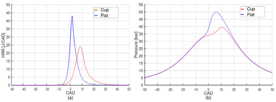 Results obtained for the two piston shapes: (a) heat release rate; (b) in-cylinder pressure.