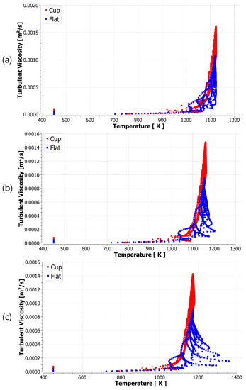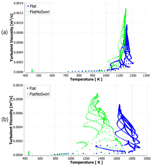 In order to assess the turbulence–chemistry interaction, Figure 9 shows the scatter plots of turbulent diffusivity versus temperature for the two engines at three different crank angles (i.e., 10, 5 and 3 CAD BTDC).