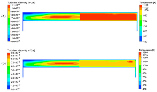 Turbulent diffusivity (left) and temperature (right) distributions at different crank angles for the flat-piston case. (a) 9 CAD BTDC; (b) 3 CAD BTDC.