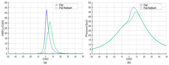 Results obtained for the two flat cases: (a) heat release rate; (b) in-cylinder pressure.