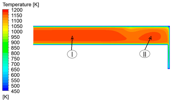 Figure 15 shows the gas temperature distribution in the engine chamber at 3 CAD BTDC. Two temperature regions are depicted where reactions occurred more rapidly. The first one, indicated with (I) in Figure 15, was located in the center of the combustion chamber; the second region, indicated with (II), was smaller and located closer to the liner. The latter was also visible in the flat-piston case with swirl (shown in Figure 10b) at higher gas temperatures, since the combustion evolved faster. Indeed, at 1 CAD BTDC, the temperature was still quite uniform, equal to about 1180 K in both high () and low turbulence () regions. Starting from TDC, combustion was favored within low turbulence regions. This is shown both in the scatter plot of Figure 13b at 5 CAD ATDC, and in Figure 16, where temperature distribution can be seen at 8 CAD ATDC.