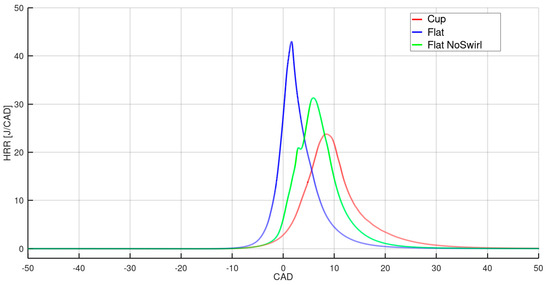 In this section, the three previous engine configurations (i.e., cup-in-piston with swirl, flat-piston with swirl and flat-piston without swirl) are compared in terms of engine performance and emissions. At first, heat release rate profiles are analyzed for the three cases, then the gross indicated work per cycle is computed and finally emissions are compared for the three configurations.