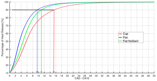 Figure 18 shows the ratio between the cumulative heat release and the total heat release as a function of CAD, referring to CA10 for all cases. The combustion durations are also shown in the figure.