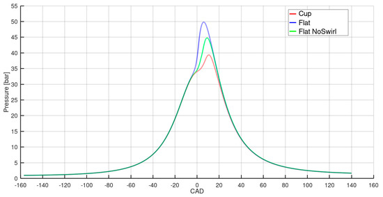 Figure 19 shows the in-cylinder pressure profiles for the three cases. For the flat-piston case with swirl, the pressure peak was equal to 49.85 bar and occurred at 6.03 CAD ATDC. This peak had an increase of 26.84% and an advance of 3.97 CAD with respect to the cup-in-piston with swirl case. This was due to both a shorter combustion duration and because a significant part of the heat was released before TDC. The pressure profile for the flat-piston geometry without swirl was in between the other two cases, with a pressure peak equal to 44.82 bar at 9.1 CAD ATDC.