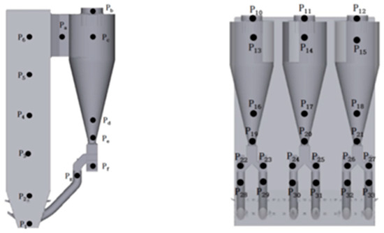 In the 350 MW supercritical CFB boiler, in addition to the arrangement of flue gas temperature, pressure, and sampling measurement points, a large number of measurement points of furnace pressure difference, bed temperature, fluidized air pressure and air volume are set to provide necessary monitoring means and protection measures to ensure the safe operation of the boiler. According to the actual position of pressure measurement points, the same pressure measurement points were set in the CPFD model. The pressure measurement point distribution is shown in Figure 2, in which Pa is the average value of 7–9, Pb is the average value of 10–12, Pc is the average value of 13–15, Pd is the average value of 16–18, Pe is the average value of 19–21, Pf is the average value of 22–27, and Pg is the average value of 28–33.