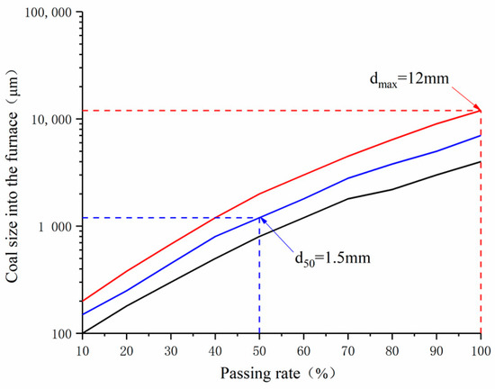 In the CFB boiler, the coal-fired crushing system adopts a two-stage crushing scheme to ensure that the coal particle size range of the furnace is 0~12 mm and the 50% cutting particle size d50 = 1.5 mm. The coal particle size distribution range is shown in Figure 3. The qualified coal enters the large coal hopper in front of the furnace, and the coal particles are sent by the coal feeder to the boiler drop tube. The starting bed material usually adopts river sand or coal ash with high burnout degree. The particle size range is 0~1 mm and d50 = 0.3 mm. The bed material particle size distribution range is shown in Figure 4. When the coal particles enter the furnace, they are not directly and fully burned like coal powder, but a series of complicated processes occur. First, under the action of a fully fluidized high-temperature bed material, the coal particles are mixed with the high-temperature bed particles and heated to dry. Then, the coal particles are pyrolyzed, the volatiles are burned, and the coal particles expand to undergo primary crushing. Finally, the remaining unburned char particles accumulate in the bed material to participate in the circulation and are sent back to the furnace through the cyclone to be burned. It takes about 8–10 min to completely burn the char particles. In the CFB boiler, the new fuel fed does not provide all the energy needed to keep the boiler burning. In combustion process, due to the large coal feed particles, the calorific value at the moment is only a small part of the calorific value of the combustion, and the combustion of a large amount of residual char stored in the furnace is the dominant calorific value.