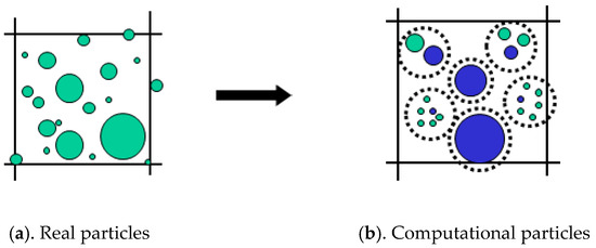 Barracuda adopts the unique computational particle method and simplifies the large number of particles into particles that can be accepted under the existing resources for simulation, which are called computational particles. Barracuda can support model calculations for calculated particles of amount 107. Figure 5 is a schematic illustration of real particles and computational particles. Computational particles are based on the basic concept of fluid micelles in Lagrangian method and extend to particle micelles formed by the particle phase. A computational particle contains multiple real particles that share the same properties, physical motion, and chemical changes.