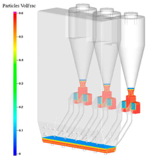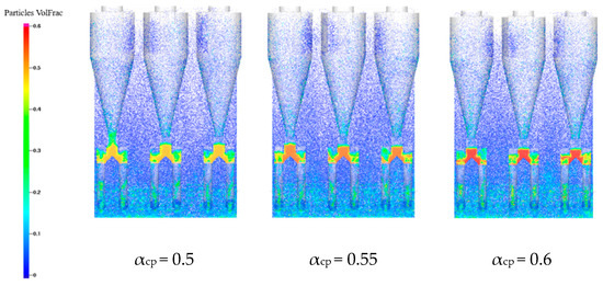 The distribution state of particles obtained after simulation stabilization is shown in Figure 9. As can be seen from Figure 9, αcp had a great influence on the accumulation of dense phase particles in the vertical riser and the return valve. With the increase of αcp, the accumulation of dense phase particles in the vertical riser was reduced and more particles were distributed in the furnace, especially in the dense phase region of the furnace.