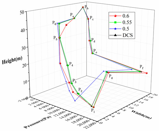 With the change of αcp, the particle concentration distribution in the furnace and the return valve changed accordingly, and the corresponding circuit pressure also changed. The influence of the particle accumulation limit on the pressure distribution of the boiler circuit is shown in Figure 10. As αcp became larger, the furnace pressure drop increased significantly. Although the material height in the vertical riser decreasesd, it assumed a larger differential pressure gradient and balanced the pressure variation of the entire circuit. When αcp was taken as 0.55, the pressure curve of the entire circuit was close to the measured result. Therefore, when αcp was taken as 0.55, the dense phase accumulation state of the material and the circulation characteristics of the whole circuit can be described relatively accurately. It is important to simulate the particle flow in the boiler, so the value of αcp was determined as 0.55.