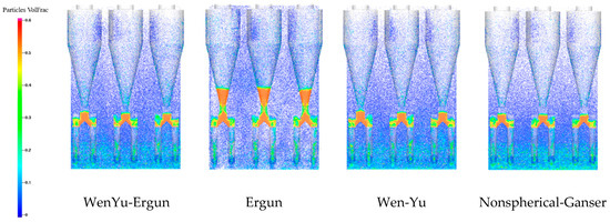 The accuracy of the gas-solid drag calculation determines the vertical distribution of particles in the furnace and the state of particle expansion in the return valve. Four groups of commonly used gas-solid drag models were compared, including the Wen-Yu model [27], Ergun model [28], WenYu-Ergun model [29], and Nonspherical-Ganser model [30].