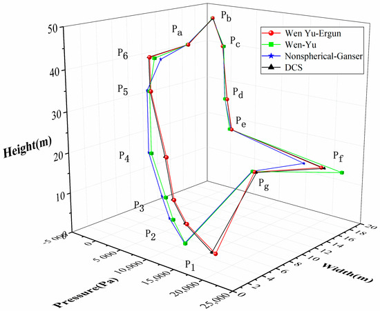 The circulation loop pressure distributions of Wen-Yu model, WenYu-Ergun model, and Nonspherical-Ganser model were analyzed. The cyclic pressure distributions of the three drag models are shown in Figure 12. It can be seen from Figure 12 that the results obtained by WenYu-Ergun model are the closest to the measured values. Therefore, the drag model used was the WenYu-Ergun model.
