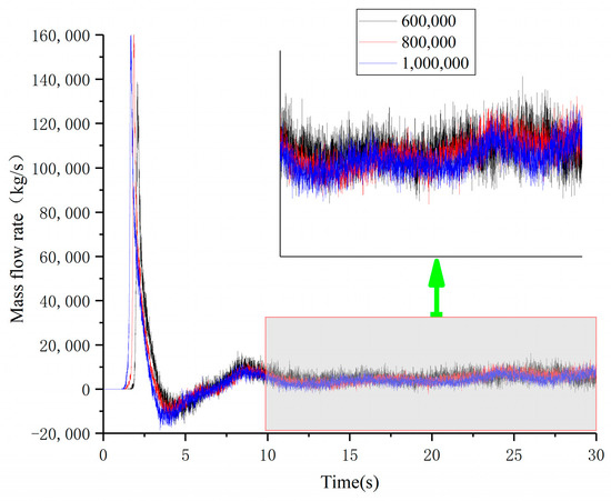 The quality of the grid directly affects the accuracy of the calculation. In addition, for industrial-level simulation calculations, at least 500,000 cells are required to capture enough information for the industrial model. Therefore, this simulation divides three kinds of meshes, of 600,000, 800,000, and 1,000,000 cells, respectively, and monitors the particle mass flow of a horizontal section in the dilute phase zone of the furnace. The calculation stability of the three mesh models is shown in Figure 13.