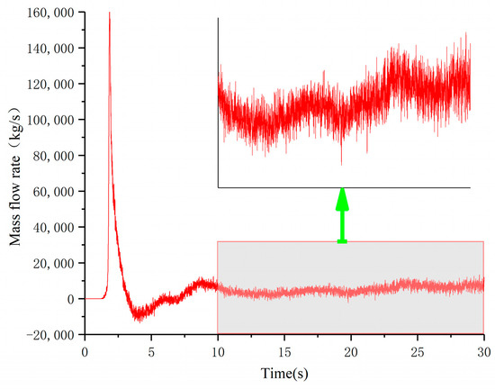 It can be seen from Figure 13 that the particle mass flow rates of the three mesh models tended to be stable after 25 s. The curves of the 600,000 and 800,000 cells were relatively close, indicating that the calculation accuracy of the two mesh models is not much different. The curve of one million grids was closer to the other two curves after 25 s. With the principle of achieving a certain precision and reducing the amount of mesh, 800,000 cells were the most suitable choice. The variation curve of the mass flow rate of 800,000-mesh model with time is shown in Figure 14.