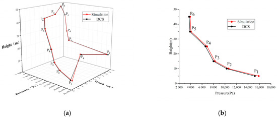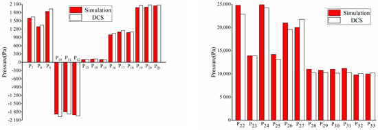 The most important of numerical simulation calculation is to verify the accuracy of numerical model. After the CFB boiler was modeled, an actual measurement was performed on the relevant measurement points of the power plant boiler, the actual working conditions were simulated and calculated, and the calculation results were compared with the measured data for verification. The reliability of the simulation results can be verified by comparing the simulation results with the measured results. The pressure is the parameter that can be obtained during the field test and the simulation process, and it is the key parameter to measure the operating state of the boiler. The comparison between the simulated value of the circuit pressure and the measured value is shown in Figure 16. Both simulated pressure and DCS pressure adopted relative pressure. The pressure simulation value of each measuring point was compared with the measured value as shown in Figure 17.