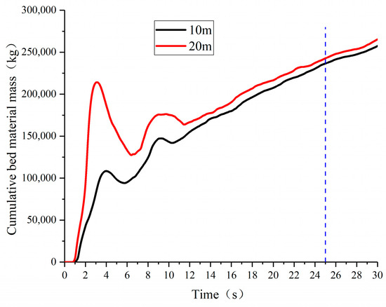 In order to determine the time required to reach a stable state during the start-up phase of the simulation process, the cumulative bed material mass through the flux surface was counted at two heights of 10 m and 20 m in the furnace, as shown in Figure 18. The slope of the curve in the figure is the solid circulation flow rate of the measuring surface. After t = 25 s, the two curves were close to parallel, which indicates that the solid circulation flow rate of the material in the furnace was consistent, and the operation of the CFB boiler reached a stable state.