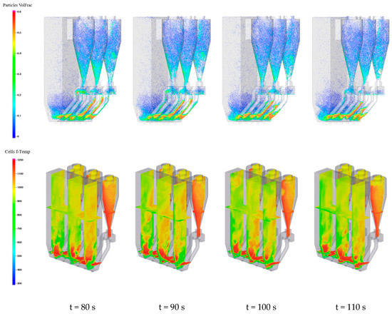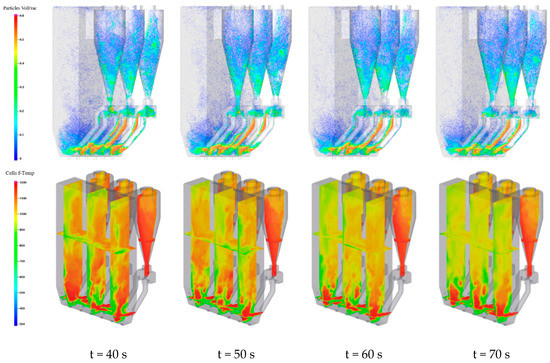 In the load-up phase of the boiler (30~70 s), the load varied from 250 MW to 350 MW, and the coal mass flow rate and air mass flow rate increased accordingly. Among them, the coal mass flow rate changed from 55 kg/s to 75 kg/s and the total air mass flow rate changed from 195 kg/s to 255 kg/s. The flow field and temperature field distribution of the boiler during the load increase process are shown in Figure 20. As the load increased, the volume fraction of particles in the dense phase zone of the furnace increased and the temperature rose. This was mainly due to the increase in the amount of coal feed and air flow, which caused more coal to burn in the dense phase zone to release heat. The amount of residual char increased, and the amount of heat generated per unit time rose, which led to an increase in the amount of material from the return legs and an increase in the temperature in the dense phase zone. As the boiler load increased, the temperature in the dilute phase zone of the furnace showed a downward trend and the flow field in the dilute phase zone tended to be evenly distributed. The temperature in the dilute phase zone of the boiler during the start-up phase was mainly determined by the initial bed material. As the load increased, the combustion share in the dense phase zone increased and the combustion share in the dilute phase zone decreased accordingly. The temperature in the dilute phase zone was gradually determined by the combustion of the residual char in the furnace. As the air volume increased, more and more materials were carried to the cyclone separator, which intensified the inner and outer circulation of the full loop. The temperature drop in the dilute phase and the flow field was evenly distributed. As the load increased, the material distribution in the cyclone separator tended to be uniform, the particle volume fraction in the return valve decreased, and the material accumulation in the return leg weakened. This was due to the increase of air volume and the accumulation of bed material to strengthen the full cycle, and the increase in the amount of materials returned from the outer circulation to the furnace, resulting in an increase in the materials in the furnace and a decrease in the materials in the outer circuit.