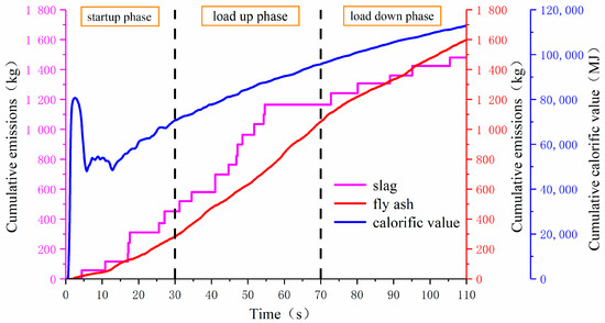 (3) During the load-up phase, the slope of the cumulative emission curve of fly ash and bottom slag increased, the cumulative emission of bottom slag fluctuated greatly as the load increased, and the cumulative emission of bottom slag was higher than the cumulative emission of fly ash. During the load-down phase, the upward trend of cumulative emissions of fly ash and bottom slag slowed down, and the cumulative emission of bottom slag was lower than the cumulative emissions of fly ash.
