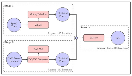 Stage one includes the vehicle drag, driveline and the electric motor, and produces a trace of electrical power draw required to run the input speed trace. This stage needs to be iterated once for each combination of speed and acceleration; a total of 105 iterations. The second stage calculates the fuel consumption and degradation for each combination of initial and final fuel cell power demand which are then used for the cost function. This stage also generates a trace corresponding to the electrical power generated by the fuel cell. This stage is independent of the vehicle speed and acceleration, and only needs to be simulated for each combination of current fuel cell power and fuel cell power demand, a total of 400 iterations in our case. The final stage uses the summation of the motor power and fuel cell power in order to calculate the response of the battery pack. As a result, it is only this part of the model which needs to be iterated for the full 2.5 million iterations.
