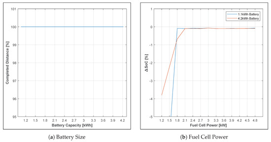 The result of each system design has been checked to ensure that it is capable of maintaining the battery SoC over all 10 logged journeys. The model is designed to stop simulating early if the battery voltage goes outside its validated range; therefore, any simulation which completes the full distance will produce valid results. It was found that all tested battery capacities were able to complete all the logged journeys without reaching the battery voltage limits, see Figure 4a. The minimum size fuel cell to meet the average power demand was dependent on the battery size. For small batteries (≤1.8 kWh), a fuel cell of at least 1.8 kW is required for the vehicle to complete every cycle without an overall loss of battery SoC over a single journey. For vehicle designs with larger battery packs (>1.8 kWh), a fuel cell of at least 2.1 kW was required, see Figure 4b, due to the increased mass of the vehicle.