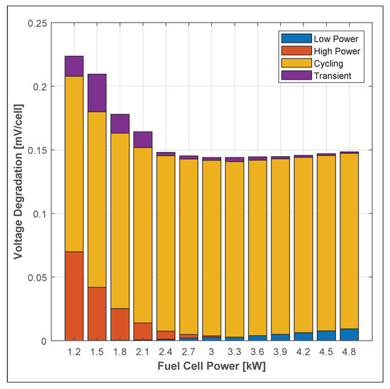 The reason for this stabilisation is shown in Figure 8. For all fuel cell sizes, the on/off cycling dominates the degradation, representing up to 94% of the degradation seen. Further reduction of this type of degradation is impossible at the system level from either a design or control perspective because this represents just a single on/off cycle per journey. For smaller fuel cells, a combination of high relative loading and transient loading is responsible for additional degradation. As the maximum fuel cell power is increased, the degradation due to high relative loads and transient loading reduces. However, for fuel cells of 2.4 kW or higher, it can also be seen that increased frequency of operation at very low relative loads causes additional degradation which outweighs the benefits of the reduction in transient loading once the fuel cell power surpasses 3.3 kW.