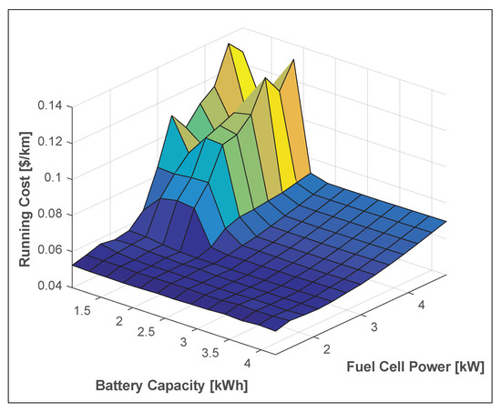 Figure 9 shows the overall average running cost of each system design. This represents a single metric which takes into account variations in fuel consumption, rates of degradation, vehicle mass and the cost of the fuel cell between the system designs and was also used to optimise the EMS. The running cost tends to follow similar trends to that of the efficiency and degradation, except with the added effect due to the increasing system cost which is proportional to the increased size of the fuel cell (assuming a fuel cell cost $50/kW).