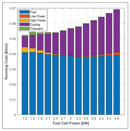 This shifts the optimal choice of fuel cell from 3.3 kW down to 2.4 kW (optimal cost). To show the reasons for this in more detail, Figure 10 shows a breakdown of the running cost as the fuel cell maximum power is varied for a battery capacity of 2.6 kWh. It can be seen that for smaller fuel cells, the cost of the fuel is the largest contributor to the change in overall running cost, but as the fuel size increases, the effectively fixed degradation associated with the single on/off cycle, combined with the increasing cost of the fuel cell, means that the small reductions in the fuel consumption and other types of degradation are outweighed by the additional proportional cost of the cycling degradation.