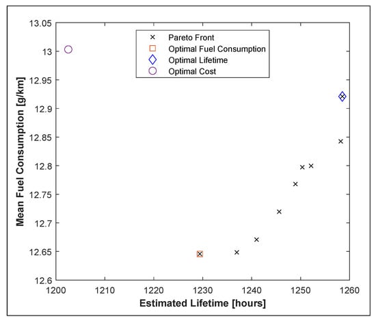 Figure 11 shows the trade-off between hydrogen consumption and fuel cell lifetime as a Pareto front. The Pareto front has a convex shape between the optimal lifetime and optimal fuel consumption designs, suggesting that compromise designs which weight these objectives against each other will be favourable over a design optimised for a single objective.