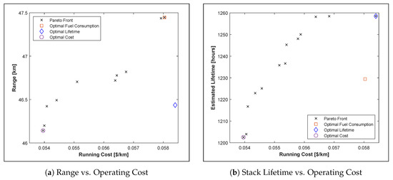 Similarly, the optimal operating cost design uses a smaller fuel cell to offset the costs of degradation which are proportional to the fuel cell maximum power. Note that in Figure 11, the optimal cost design is clearly behind the Pareto front for hydrogen consumption and fuel cell lifetime. This is due to the increasing cost as the size of the fuel cell increases which is not taken into account in this comparison. Figure 12 shows the Pareto fronts for range (Figure 12a) and lifetime (Figure 12b) against the operating cost. Note that in both cases, the Pareto front is convex allowing engineers to select a design which compromises the three criteria presented depending on the exact design requirements of the vehicle and the relative weighting applied to each objective.