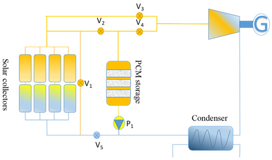 Figure 1 depicts the schematic diagram of the present DVG solar ORC system integrated with a PCM storage tank. The performance of the system was evaluated by utilizing hourly weather data. The present system was made up of an arrangement of EFPC solar thermal collectors, a PCM storage tank, a turbine coupled with a generator, a water-cooled condenser, control valves, and an organic fluid pump. The proposed system was selected because of its lower complexity and simple control. The PCM storage tank operates in two modes, namely, a charging and discharging mode. Moreover, due to the lower complexity and simple control, a basic DVG solar ORC system was selected for the present study.
