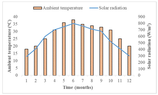 Typical meteorological year (TMY) data for Karachi City in Pakistan was used to carry out the simulation process. The TMY data was obtained using Meteonorm software and was imported into the MATLAB model. Figure 2 presents the monthly average ambient temperature and solar radiation data that was available. The month of June was found to be the hottest month, while January was observed to be the coldest month due to the maximum and minimum solar radiation and ambient temperature, respectively.