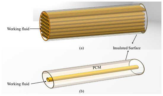 A shell in the tube heat exchanger that was filled with PCM was selected as a thermal storage tank, as shown in Figure 3. The heat storage tank was of cylindrical shape and consisted of multiple tubes. The bigger tube had a 10 times larger diameter than a mini-tube but its length was equal to the mini-tube. There was a mini-tube inside each tube. The larger diameter tube was filled with PCM, while the working fluid passed through the mini-tube [33]. The outside wall of the heat storage tank was presumed to be insulated. The heat storage tank worked in both charging and discharging modes based on operating and boundary conditions. Energy was delivered from the working fluid to the PCM during the charging mode. Conversely, the PCM released energy to the working fluid during the discharging mode. A famous enthalpy method was employed to carry out the thermodynamic modeling of the PCM storage tank [35,36]. To compute the flow of heat within the heat storage tank, few assumptions were made while developing the heat storage model, as follows: