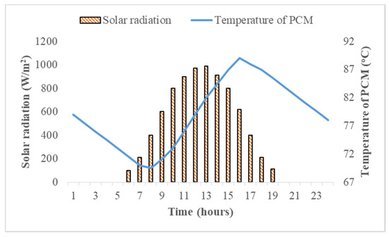To check the dynamic performance of the storage tank, Mg(NO3)2·6H2O was selected as the storage material. The performance of the system was analyzed during the hottest week of the year (the second week of June). Figure 5 shows the change in PCM temperature and solar radiation with time. A 1 h time step was chosen for the complete simulation process. The initial temperature of the PCM was selected to be 10 °C lower than the melting point of the PCM. In the beginning, the PCM temperature decreased till 8:00 a.m., then it increased till 4:00 p.m., and decreased again till midnight. Moreover, it was found that PCM storage was enough to run the system for the whole day.
