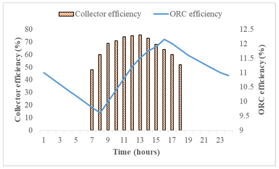 The average daily performance of the PCM-based DVG solar ORC system over a week was analyzed. Figure 6 presents the change in the collector and ORC efficiencies with time. It was found that the ORC efficiency remained in the range of 9.8 to 12%. However, the solar collector efficiency remained in the range of 48 to 75%. Hence, the solar ORC system worked well over 24 h.