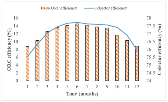 The collector efficiency represents the performance of the EFPC collector array, while the ORC efficiency represents the efficiency of the whole proposed cycle. Figure 7 shows the daily average change in the collector and ORC efficiencies of the PCM-based DVG solar ORC system for each month over a year. It was found that both parameters (the ORC and collector efficiencies) changed with the change in ambient temperature and solar radiation. Therefore, the aforementioned parameters were directly impacted by the weather pattern of the selected location. The maximum values of the ORC and collector efficiencies were found in June, which was the hottest month of the year, while the minimum values were observed in January, which was the coldest month of the year. The daily average collector and ORC efficiencies over the whole year were found to be 76.9 and 12.1%, respectively. The system performance in terms of the collector and cycle efficiencies was found to be at a maximum in summer, while its value was at a minimum in winter.